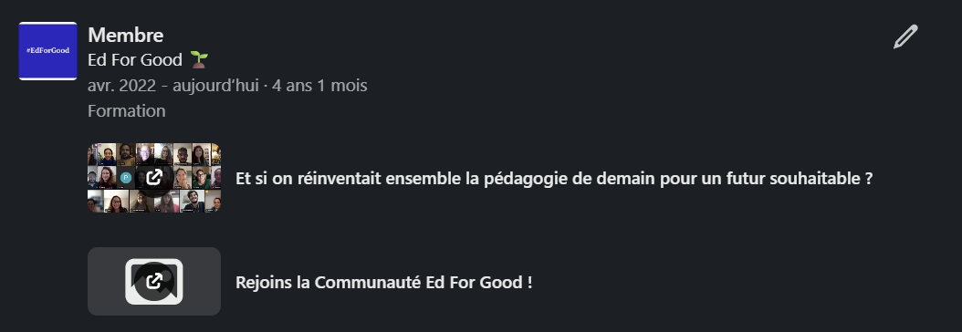 - Entreprise / Organisation : Ed For Good (https://www.linkedin.com/company/edforgood/)